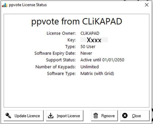 To discuss renewing your agreement, or if you believe the information shown in the licence status window is incorrect, contact sales@clikapad.com and please state your license number.
